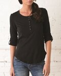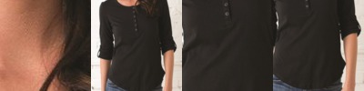 - 3-button Y-neck placket with coverstitch detail and metal buttons