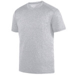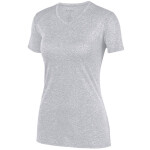 100% polyester heathered wicking knit * Cationic dye used to create heathered look and reduces chance of dye migration * Wicks moisture away from the body * Ladies' fit * Pad print label * Self-fabric narrow feminine V-neck collar * Set-in sleeves * Double-needle hemmed bottom and sleeve