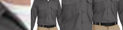 - Two button-thru, hex-style pockets with angled bartacks, bartacked pencil stall on left pocket