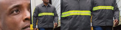 - Contrast-color, topstitched self-fabric sleeve stripes