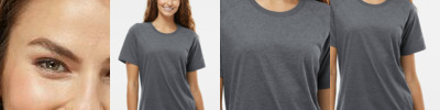 100% polyester heathered wicking knit * Wicks moisture * Ladies' fit * Tag-free label * V-neck collar * Set-in sleeves