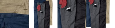 - Two slack-style front pockets, two back patch pockets with spade pocket flaps and snap closures, two patch leg pockets with inverted center pleat, one piece pocket flap with mitered corners, two snap closures