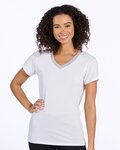 100% polyester wicking knit * Wicks moisture * Ladies' fit * Tag-free label * Asymmetrical contrast color yoke