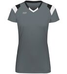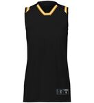 Color side is 100% polyester propelit micromesh wicking knit * White side is 100% polyester wicking knit * Wicks Moisture * Ladies' fit * Outside locker label * V-neck collar * Contrast color inserts and piping * Fully reversible * Each layer hemmed separately for easy embellishment * Designed to be NFHS compliant
