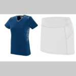 92% polyester/8% spandex wicking pinhole mesh * 100% polyester printed wicking knit inserts and collar * Wicks moisture away from the body * Ladies' fit * Heat sealed label * Self-fabric V-neck collar * Set-in sleeves * Double-needle hemmed sleeves and bottom